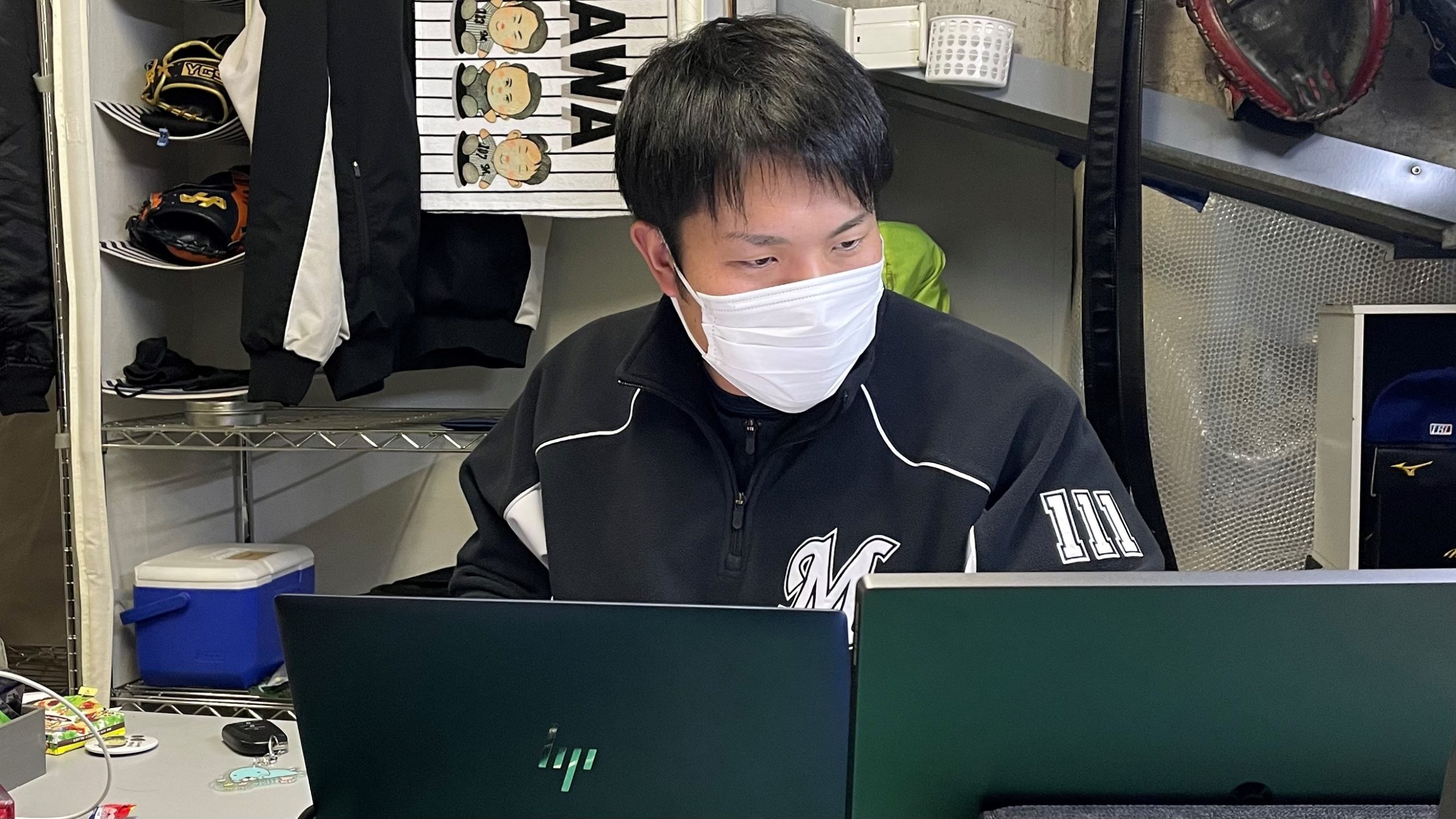 千葉ロッテマリーンズの本拠地であるZOZOマリンスタジアムの一角にある用具室。なかみぞさんら用具係はキャンプに向け、この部屋で昨年から準備を進めてきた。「こっちにいるうちにしたかったことは大体できたと思う。あとは向こうで汗だくになってやってきます」なかみぞさんは年末から年始にかけてキャンプで使う道具の準備や各方面との打ち合わせ、自身のエンターテイメント活動など精力的な活動を見せた。