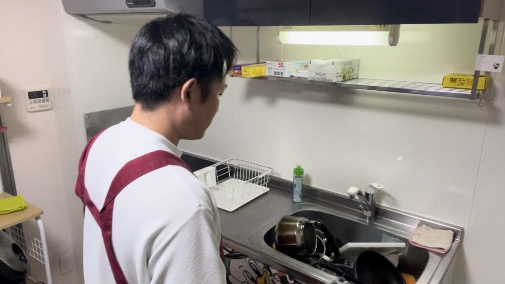 洗い物が溜まった場面で台所に立つなかみぞさん(写真左)