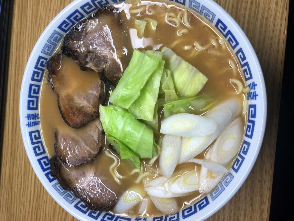 ラーメンはゆでるタイプの袋麺でスープはとんこつ醤油味、具にはネギとキャベツ、チャーシューが使われていた。