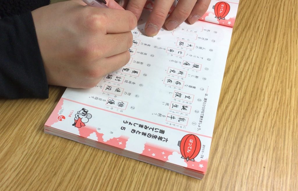なかみぞさんが取り組んでいるのは小学六年生向けの漢字ドリル。「基礎から固めていこうと思ったら大体この辺り(のレベル)からかなと思った。こういう基礎固めはこの時期にしかできないからね」と笑顔で話す。
