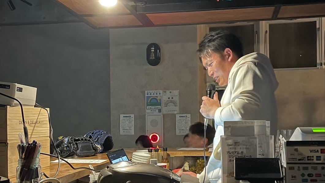 カウンターからPowerPointを使ってトークを披露するなかみぞさん(写真右側)