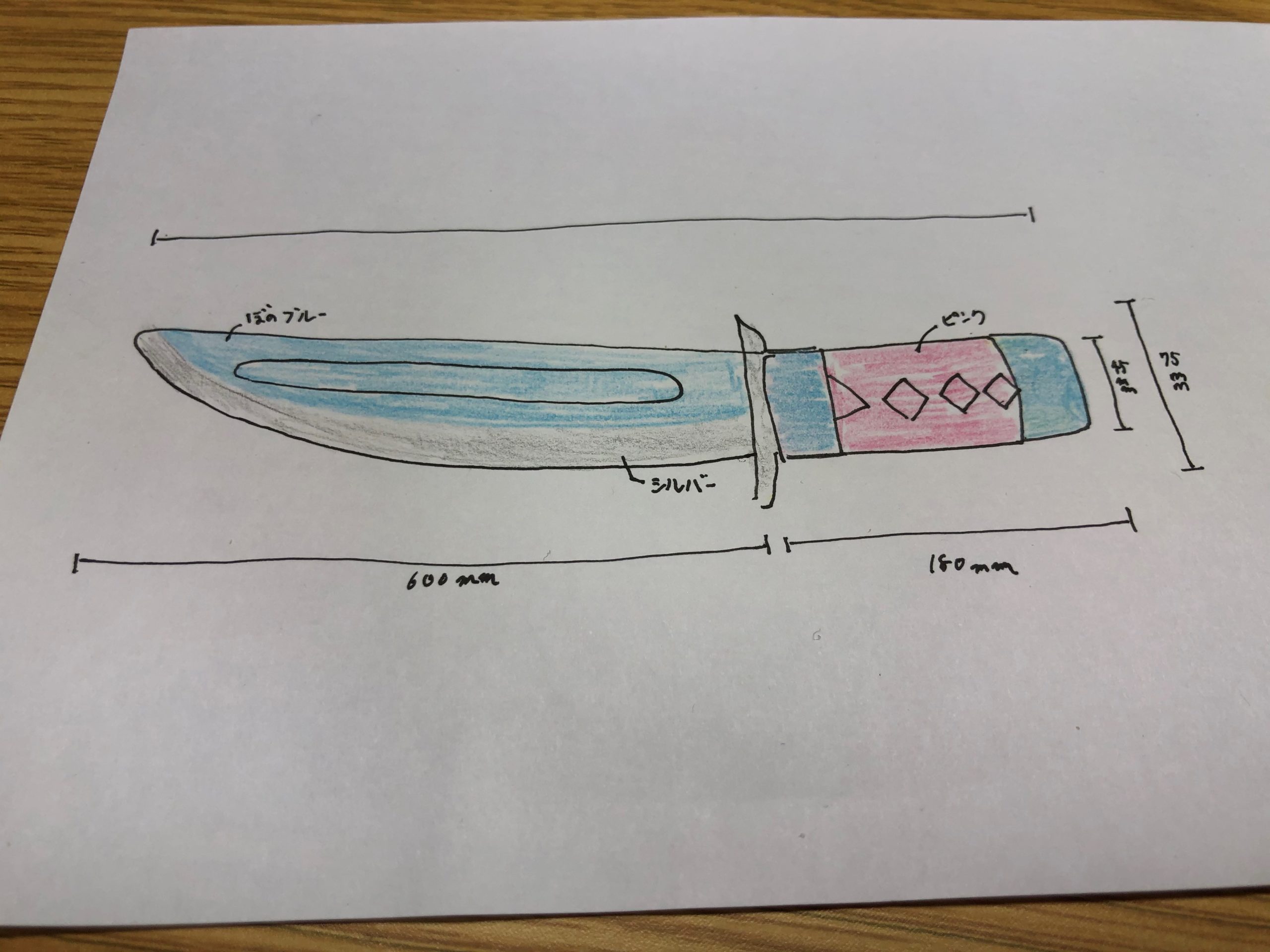 人気アニメ「鬼滅の刃」に例外なく感化されたなかみぞさんは今月21日、オリジナルの日輪刀の設計図を作成した。作成された設計図には”ぼのブルー”と呼ばれる明るい水色を基調とした刃(は)に”貝がらピンク”と呼ばれる濃い桃色の柄(つか)というデザインの日輪刀が描かれている。