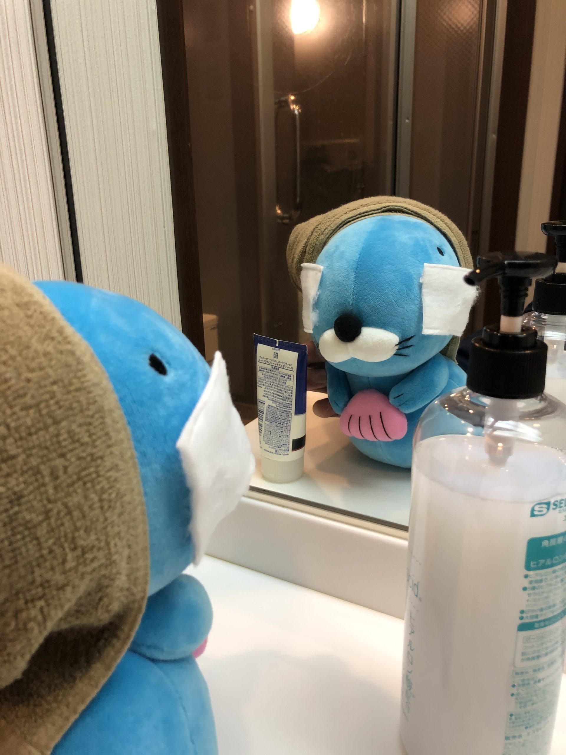 お風呂から出て体を拭いた後は持参した化粧水を自身の顔面に打ちつけた。「化粧水は質より量と聞いたことがあるのでたくさん入っててお手頃な価格のものを購入した。惜しみなく使っている」と一応お肌にも気を使っている様子。