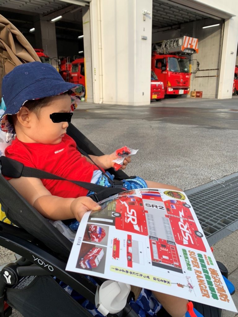 ひと通り視察を終えた甥みぞに消防士からスーパーレンジャーの消防車両のおもちゃとペーパークラフトが贈られた。